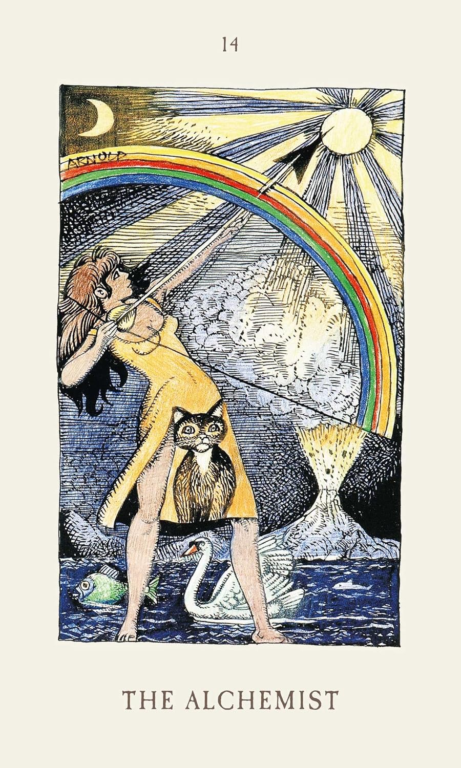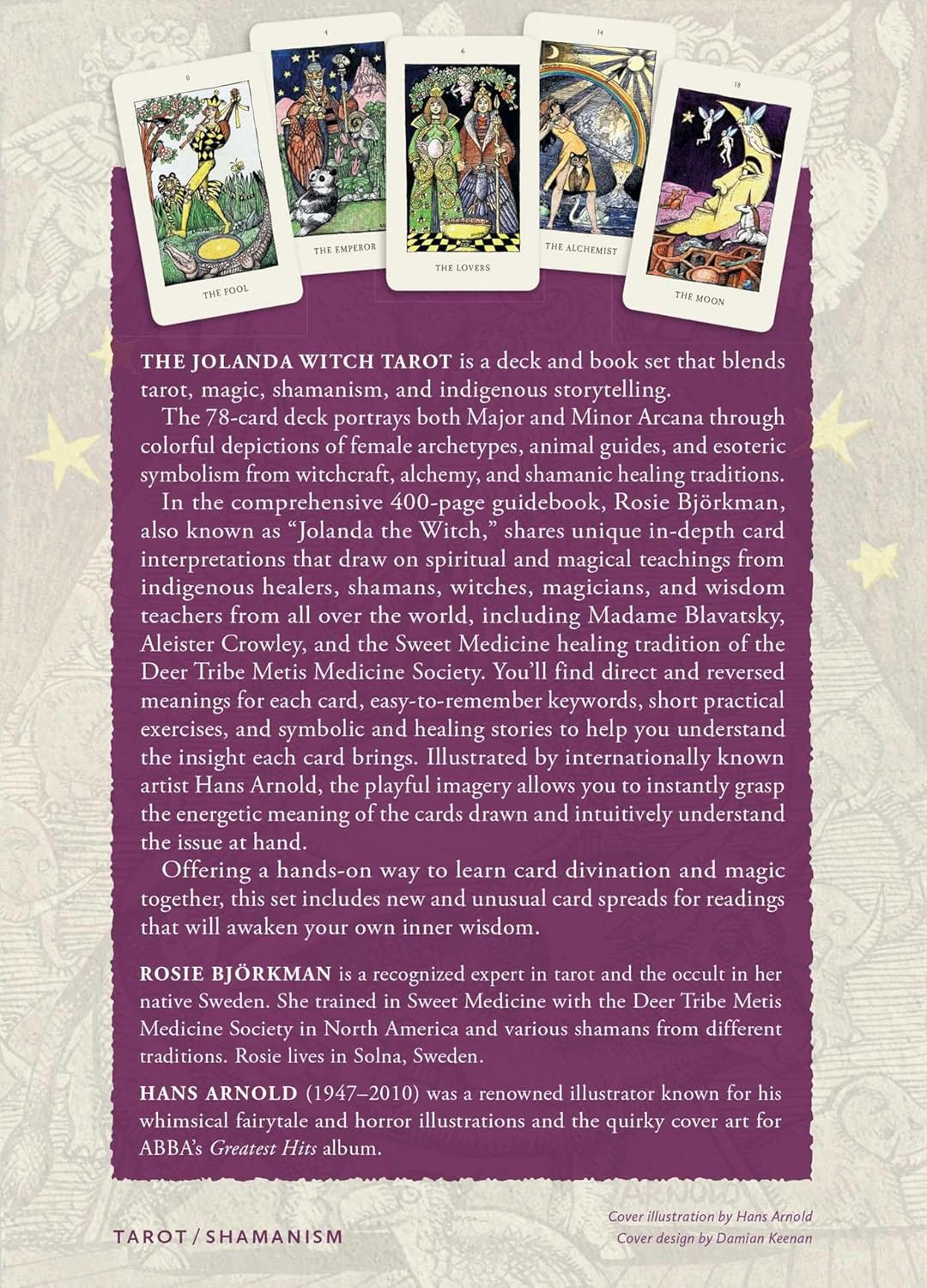 In the comprehensive 400-page guidebook, Rosie Björkman, also known as “Jolanda the Witch,” shares unique in-depth card interpretations that draw on spiritual and magical teachings from indigenous healers, shamans, witches, magicians, and wisdom teachers from all over the world, including Madame Blavatsky, Aleister Crowley, and the Sweet Medicine healing tradition of the Deer Tribe Metis Medicine Society. You’ll find direct and reversed meanings for each card, easy-to-remember keywords, short practical exercises, and symbolic and healing stories to help you understand the insight each card brings. Illustrated by internationally known artist Hans Arnold, the playful imagery allows you to instantly grasp the energetic meaning of the cards drawn and intuitively understand the issue at hand.