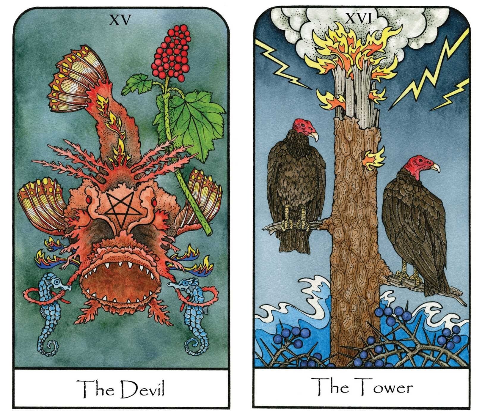 In the accompanying guidebook, each card is given a two-page description that opens with the traditional Tarot meaning of the card, followed by a detailed explanation of the symbolic meaning of the specific plants and animals the card features. For example, on the cover, the Magician card shows a Merlin Falcon, Amanita Muscaria mushroom, Western Sword Fern, and the Eastern Pondhawk Dragonfly--each of these life forms was chosen because it represents one or more aspects of the Magician’s meaning in the Tarot. The book explains the connections between each form shown and the card’s Tarot archetype, further illuminating the meaning of the card and how it relates to the natural world, personal development, and the journey of the soul.